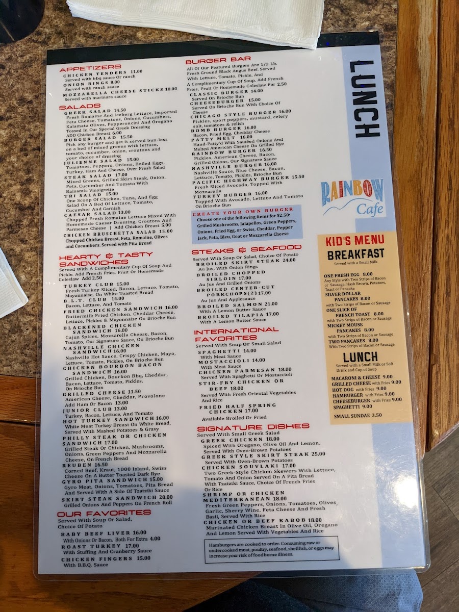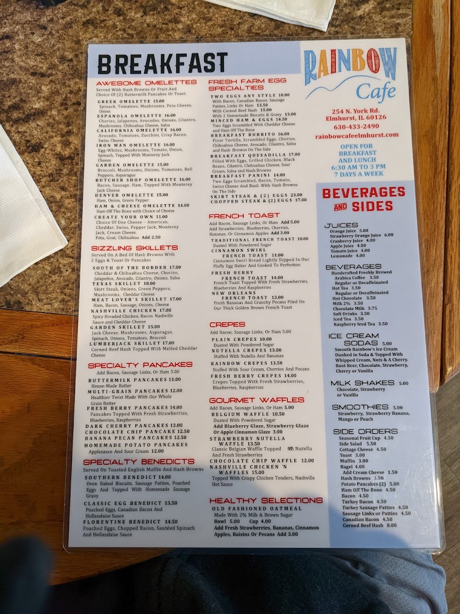 Welcome to Rainbow Cafe Elmhurst, located at 254 N York St in Elmhurst, IL. This charming establishment boasts a menu that's a delightful mix of hearty breakfast and lunch options, perfect for any palate. Patrons rave about the generous portions, like the famous black & Bleu burger and build-your-own omelettes that are as substantial as they are delicious.